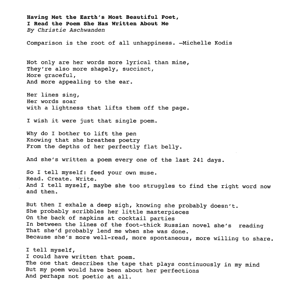 CHRISTIE: It’s so tempting to think that if only we achieve X, Y or Z, everything will be perfect. That’s the real problem with envy— it’s based on a false belief. I suppose that’s what I wanted to tell you with my poem—hey, I’m not perfect at all. In fact, I was nervous about sending it, because it felt like a pale imitation of yours.