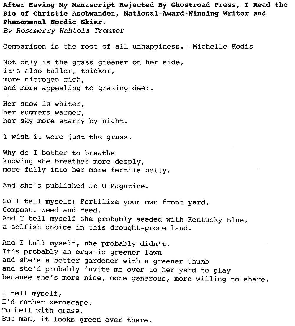 ROSEMERRY: When I wrote the poem, I had just received a rejection letter from Ghost Road Press, declining my poetry manuscript. My ego was tremblesome and withered. And then an hour later, I was writing the press release for your workshop and I read your bio. On paper, you seemed to have achieved the kind of writing life I wanted for myself. Plus, I had come in far behind you in Nordic ski races. I thought—wow, she’s really made it.