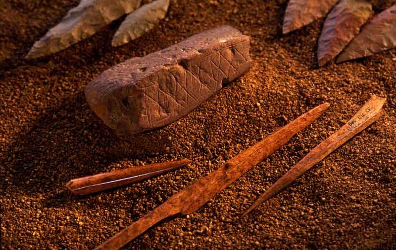 Photos: REplica of art from Altamira Cave, courtesy José-Manuel Benito; Atlatl carved in shape of creeping hyena from La Madelaine rockshelter, courtesy Wikimedia Commons; etched ochre from Blombos Cave, courtesy C. Hensilwood and Wikimedia Commons.