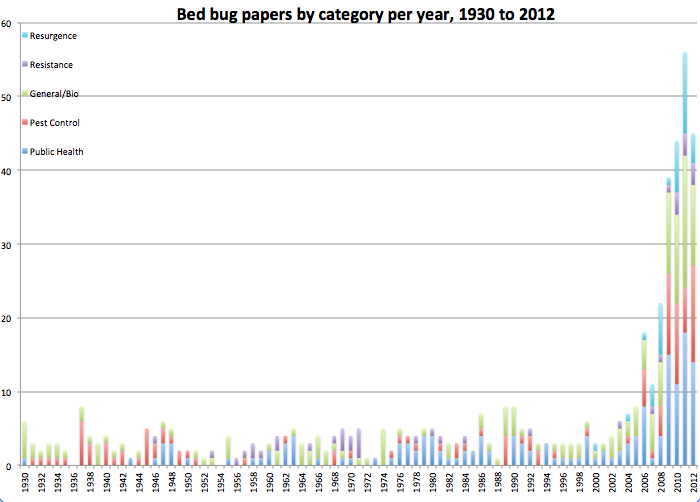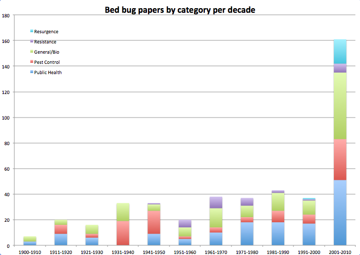 My database is by no means exhaustive or perfect. The results could be influenced by external factors like publishing trends, as is noted in these posts and their comments on a related topic, or by how I decided to categorize the data, or whether the source databases represent the reality of what was actually published, especially for older studies. But, it is clear that the tidy story claiming no bed bug research followed WWII isn’t quite right. Bed bugs weren’t a wildly popular topic, but people still studied them a little bit. The other data organization also paid off, because the graphs visualize when papers on pesticide resistance snuck in (after DDT had been around for a few years), who was doing research when, and how the number of publications jump dramatically after the bed bug resurgence.