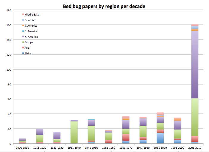 This is partly true. But, during my research, I kept coming across bed bug journal articles from the seventies and eighties. My question was, if no one was studying bed bugs, why were they publishing studies about them? I decided to map out all of the journal articles I could find and see if the trend matched the story.