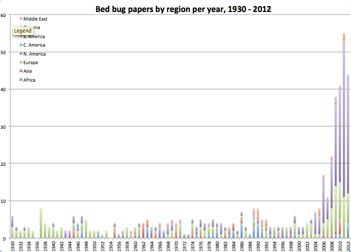We’ll use my own data mining project as an example, in which I was trying to look at trends in bed bug research since the early 1900s. Uh, why, you ask? I’ve been working on a book about bed bugs for two years, and I was trying to answer a question. During my research, nearly every bed bug expert has told me that when bed bug populations dropped drastically after World War II and the advent of DDT, at least in some parts of the world, research on bed bugs similarly dropped for many decades. Then, when it was evident to scientists that the bed bugs were resurging in the early aughts, they had to relearn how to raise the bugs in the lab and how to study them.