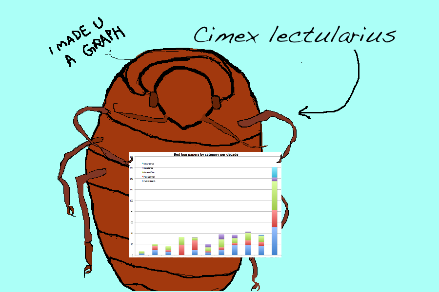 Mike the Mad Biologist: I tried doing this with a subset of data, using the total number of papers per year. It reversed the trend after WWII, but it also made the most recent papers over the last decade seem negligible, and I wonder if the exponential influx of new journals covering increasingly nuanced subject matter– many of which would never cover bed bug research– is skewing the results. It seems like I should just use a subset for the “total number of papers” within the journals that actually cover something like bed bugs, but I don’t see any way to pull this data out.