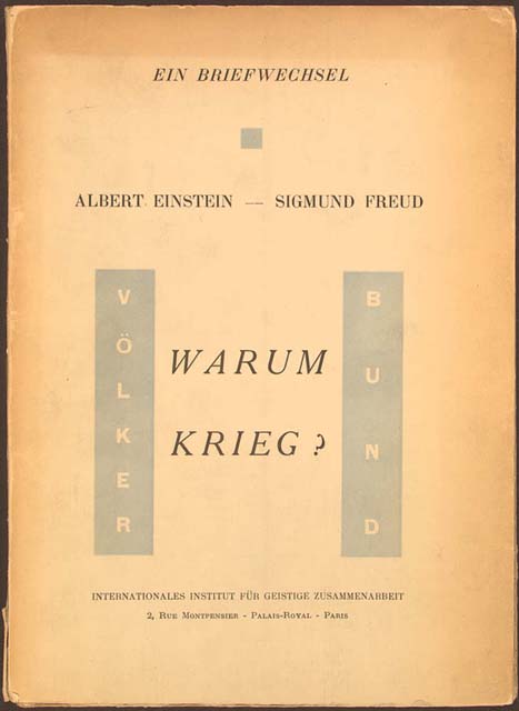 The fact is, Einstein and Freud would later correspond from time to time, mostly expressing mutual admiration amid birthday wishes, and when the League of Nations’ Institute for Intellectual Cooperation enlisted Einstein to engage in a public correspondence with another world-famous figure, Einstein immediately approached Freud. In answer to the title question of the resulting volume, Why War?, Einstein borrowed Freud’s own terminology: “Because man has within him a lust for hatred and destruction. In normal times this passion exists in a latent state, and it emerges only in unusual circumstances; but it is a comparatively easy task to call it into play and raise it to the power of a collective psychosis.” To which Freud, who privately thought the project “tedious,” replied, “you yourself have said almost all there is to say on the subject.” Then he went on to give his own answer to the question of Why War?, at four times the length of Einstein’s response.