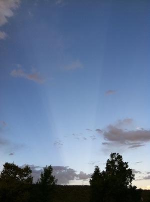 I shared my photo with our neighbor Art, an avid skywatcher and vice-president of our local astronomy club. Art informed me that what I’d seen were anticrepuscular rays. Most people have seen crepuscular rays, but anticrepusular rays are a rarer sight, probably because most of us have our backs to them as we oooh and aaah over the sunset that’s usually taking place in the opposite direction.