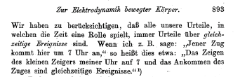 “If, for example, I say that ‘the train arrives here at 7 o’clock,'” Einstein writes in that paper, “that means, more or less, ‘the pointing of the small hand of my clock to 7 and the arrival of the train are simultaneous events.'” That seemingly casual “more or less” is crucial. Whatever distance separates your timepiece from the train is a measure of how far in your past the arrival of the train is. For that matter, the timepiece is in your eyeballs’ past. And the photoreceptors in your eyeballs are in your neuron-firing brain’s past. But as Einstein said, for the sake of his argument we can leave those subtleties aside.