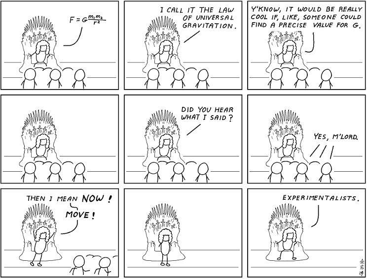 4) Finding that number is not the job of theorists, like Newton, but of the “half-human creatures doing their bidding” (a quote from a physicist), the experimentalists.  5)  Experimentalists have the dirty job of dealing with reality, in this case, the reality of trying to measure a small gravitational constant while stuck in the earth’s large gravitational field.  “Just take the earth away,”  say the theorists.  6) So finding G took experimentalists over a century — “Experimentalists, get your shit together,” says AG’s little mouseover.