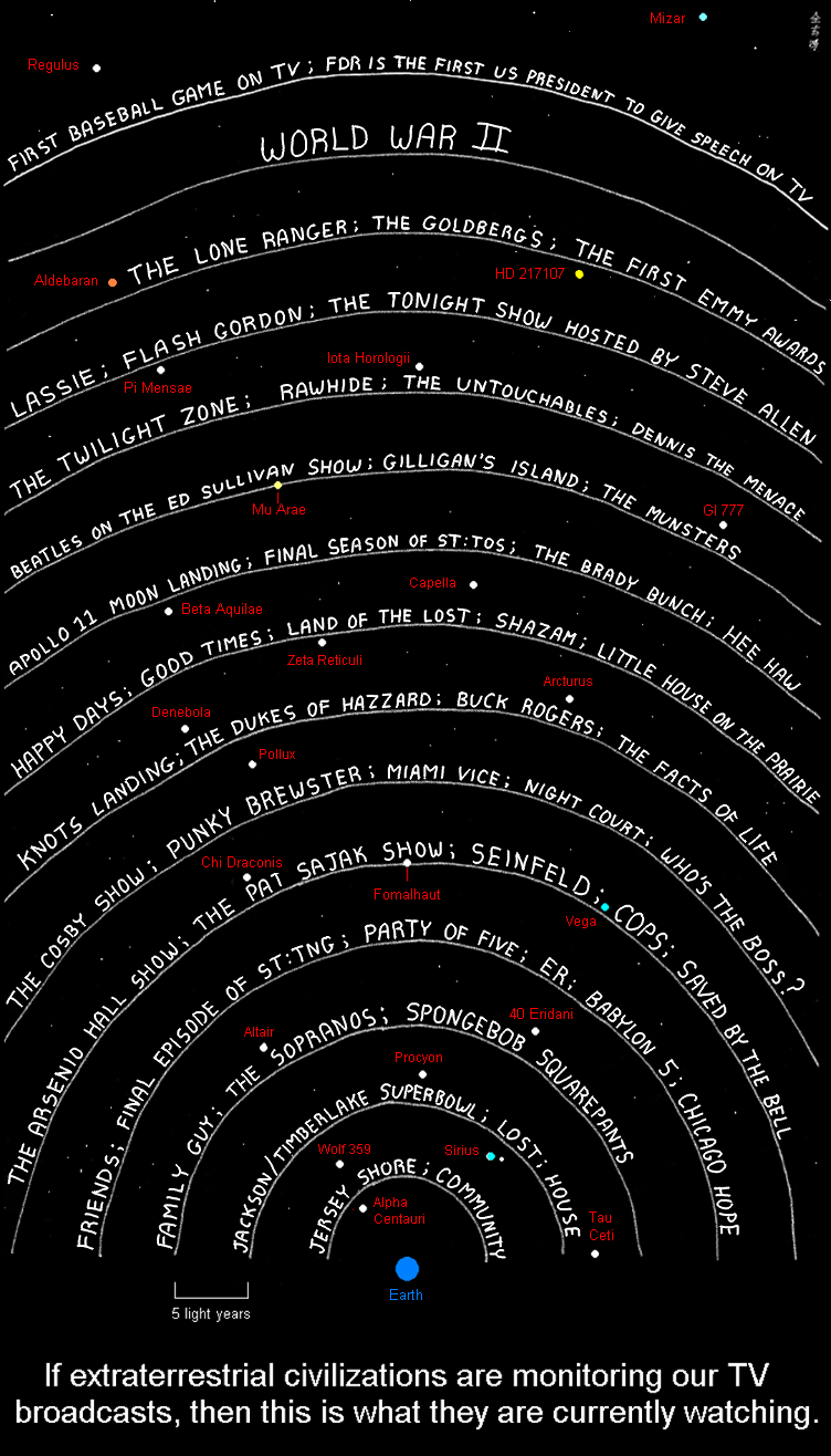 electromagnetic_leak_2014You get this, right? that light travels at a certain fixed rate so TV programs (yup, light) leaving Earth in, say, 2010 would have gotten 4 light-years away and any star 4 light-years away would just be getting the program now.  I’ve understood this idea for decades and I still get confused by it.
