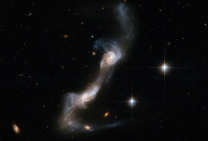 Splendid, isn’t it. It’s UGC 8335 — one name, so once it was apparently mistaken for one thing though obviously it’s two. They’re spiral galaxies in the process of running into and through each other. This is a photograph by the Hubble Space Telescope; the galaxies are really there; this is real. You could think of this photo as a single frame in an extremely long movie. But you could see the movie only if somebody made it up out of whole cloth, i.e., not real. Like this: