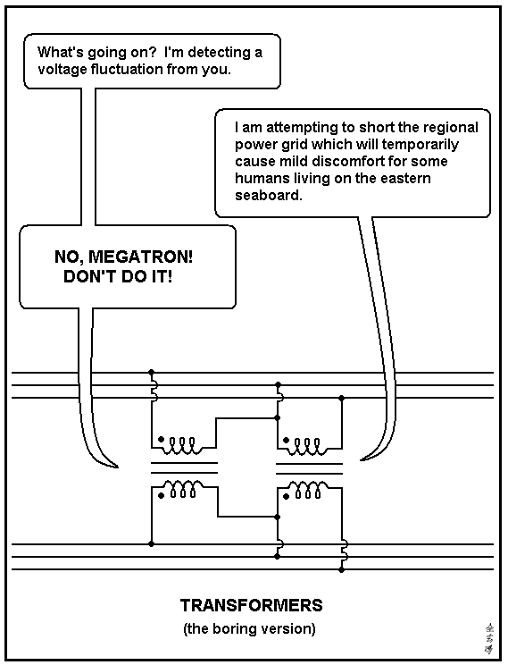 decepticons_attackI’m pretty sure that a Transformers™ movie came out a few years back, and I’m dead certain that the neighborhood kids regularly call on me to admire their transformable Transformers™ toys.  And I think a Transformers™ movie came out just recently but I don’t know anything about it.  It’s probably all explosive and apocalyptic.  I’m too old for these things, and anyway, if you’ve ever been in the middle of an east coast voltage drop, that’s apocalypse enough for anybody
