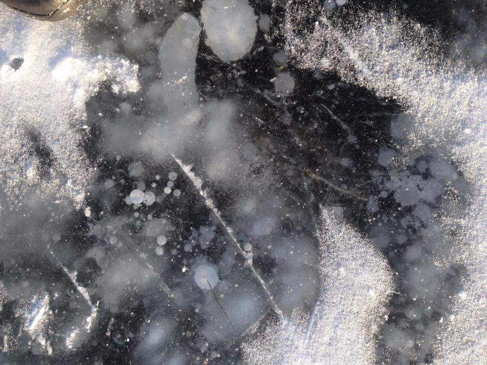 The ice on the lakes around here has thickened already to the requisite six inches or more.  That’s what allowed my friend Tom Andrews to snap these photos two weeks ago. (Note the methane bubbles under the ice – signs of melting permafrost).