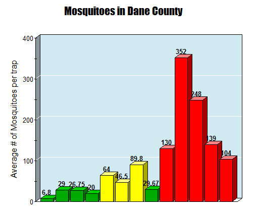 Researchers at the University of Wisconsin monitor mosquitoes in and around Madison, where I live. One night each week they set out carbon dioxide traps in six different locations. And their 2016 numbers match my perception. Mosquitoes weren’t a problem, and then one day they were. I’ve put together a sad bar graph that clearly illustrates this. Each bar represents one summer week. Back in June (green), there were just a handful of mosquitoes in the traps. And then we hit August (red), a perfect cocktail of wet and hot, and the population skyrocketed.