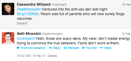 Screen Shot 2013-04-05 at 3.27.57 AMMaybe some of the parents in that room were true believers, but what about everyone else? The antivax lobby has found a way to reach them. Now how can I?