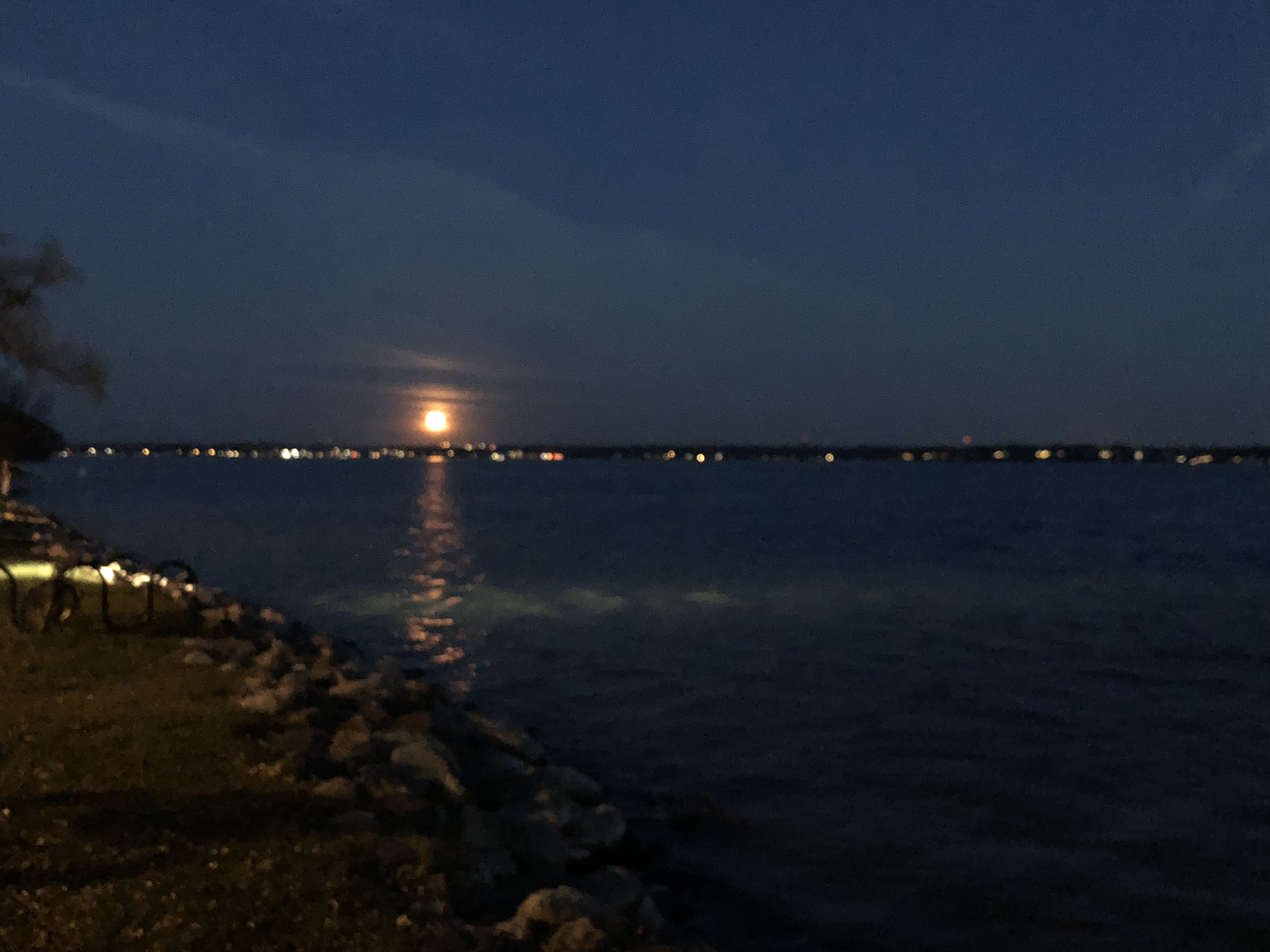 I swerved into a parking lot and stopped in front of a boat launch. We leaped out and raised our phones to capture the perfect moon shot. I wanted some record of this glorious orange orb, this floating jack-o-lantern, this magnificent celestial body, this . . . why am I bothering with all these adjectives when I could just SHOW you what I saw?!