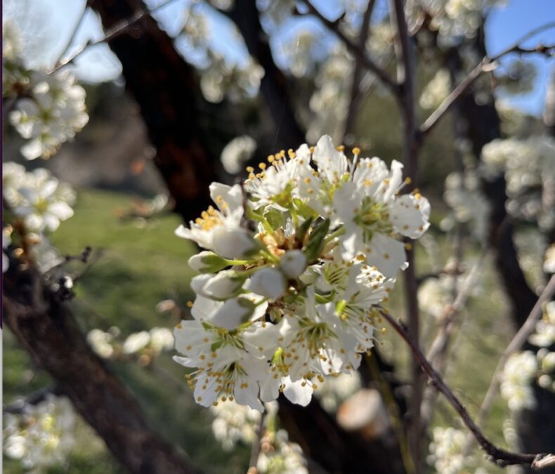 I live on a small farm and orchard, and right now it’s a magical place, full of blooming fruit trees and the wondrous fragrance of fruit blossoms. Walking through our orchard when the trees are blooming is one of the things that make me most grateful to be alive. Apricot blooms are my favorite fragrance, but plums are not far behind. Pear trees have a distinct, but less sweet aroma, and the cherry trees are nice, but lag behind the others. Although I enjoy comparing the aroma of the various blooms, what’s most important is to take a moment to appreciate how fortunate I am to be here to experience these natural wonders. I love to stand beneath an apricot tree in bloom, close my eyes and take in the fragrance while listening to the buzz of pollinators visiting the blooms.