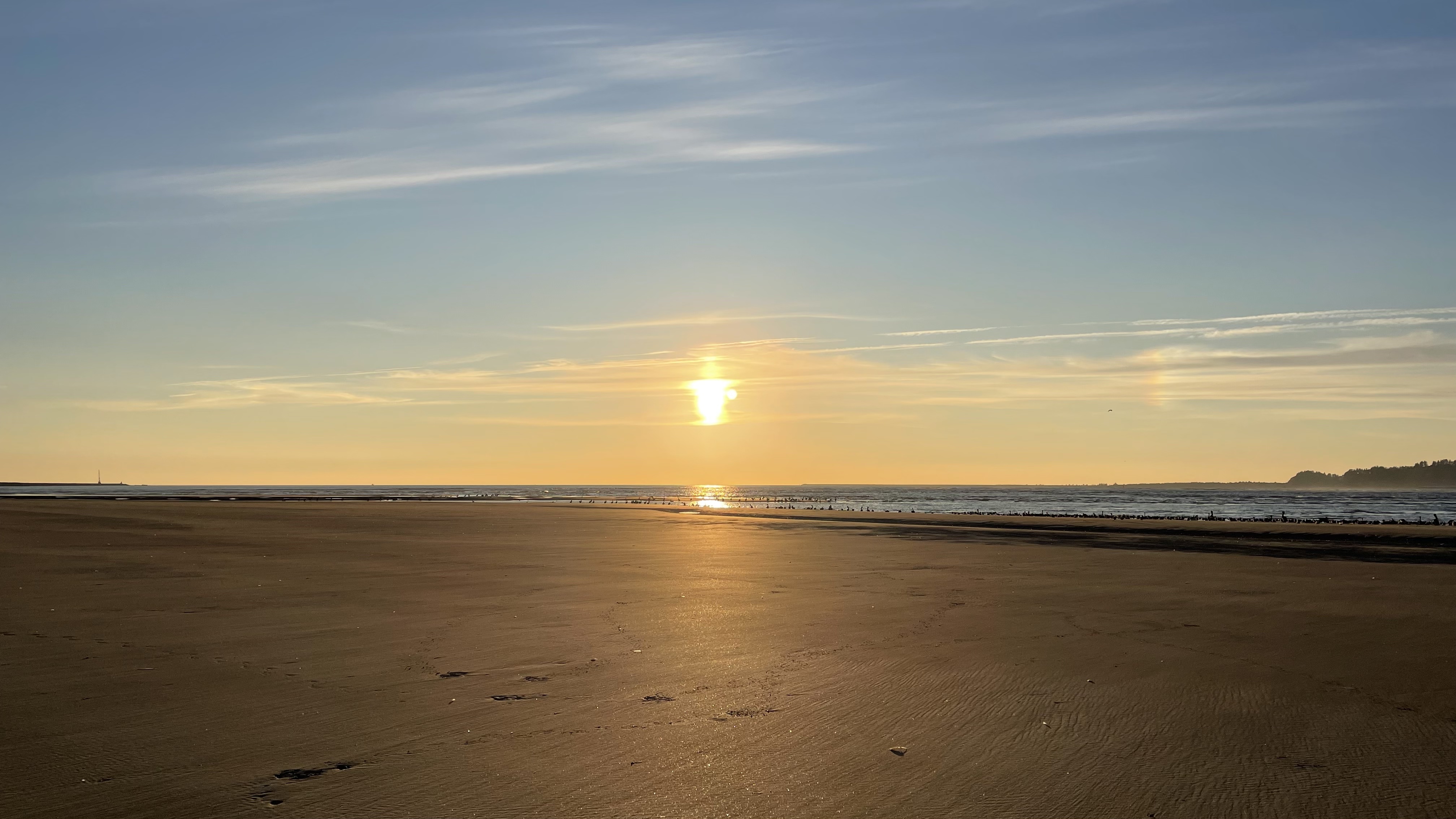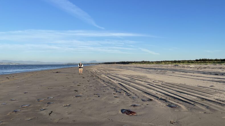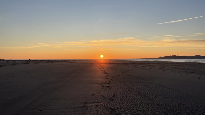 It was the evening of the second day, and we had decided to go to Clatsop Spit at Fort Stevens State Park, a few miles from Astoria. We parked and made our way through dunes and beachgrass to the beach. There we turned west, walking along soft wet sand.