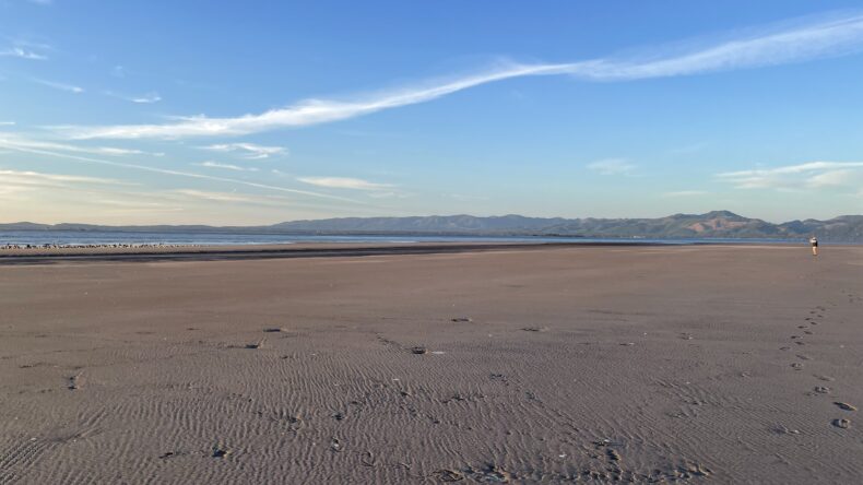 We went back to our slow stroll, he with his phone at the ready, me with my binoculars. I was again sweeping the flock because you just never know when I saw out of the corner of my eye a quick movement. The movement resolved into a being, small and sickle-shaped, flying low over sand. “Hey!” I yelled. “Hey! Hey! It’s a snowy plover!” I tracked it with my binoculars for a second or two, and then whipped out my phone and snapped a couple of pictures as the plover flew down to the wet sand, weaving and cutting, before it disappeared among the throng of larger, more stolid birds.