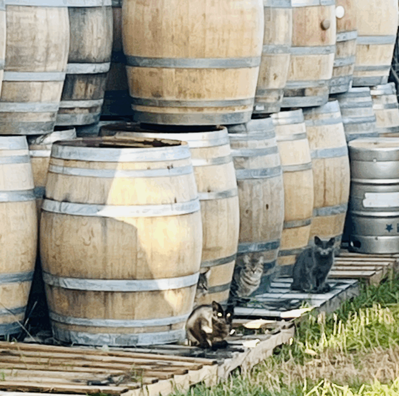 Oh, and the tigers! Ok, tiger striped cats, but they think they’re tigers. Sometime this summer a mamma cat started hanging around our winery. They were hungry, so I gave in and began feeding her and her five kittens — two black, one gray and two tiger striped tabbies. We have managed to trap all but one of them (still working on it!) to vaccinate and spay or neuter, which I’ve learned is no easy task.