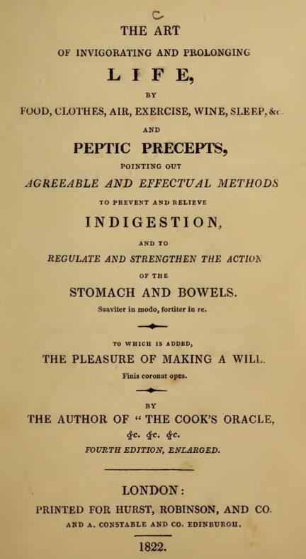 William Kitchiner, The Art of Invigorating and Prolonging Life, by Food, Clothes, Air, Exercise, Wine, Sleep, &c. and Peptic Precepts (London: Hurst, Robinson, and Co., 1822)